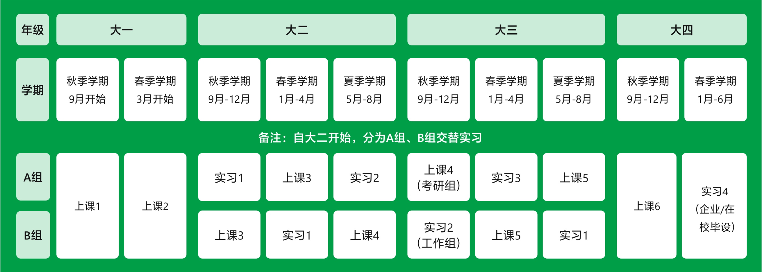自大二开始,开展4次为期3-4个月的企业带薪顶岗实习或在科研项目中学习;